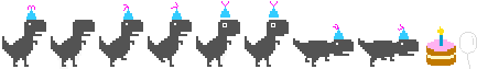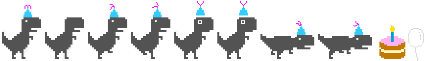 برتھ ڈے ایڈیشن کلاسک لامتناہی رنر میں جشن کی رونق شامل کرتا ہے! کروم کی سالگرہ کے لیے ریلیز کیا گیا، اس میں جمع کرنے کے قابل کیک ہیں جو تمہارے ڈائنو کو ایک پارٹی ہیٹ دیتے ہیں، اور صحرا کے پس منظر کے خلاف تیرتے ہوئے غبارے۔